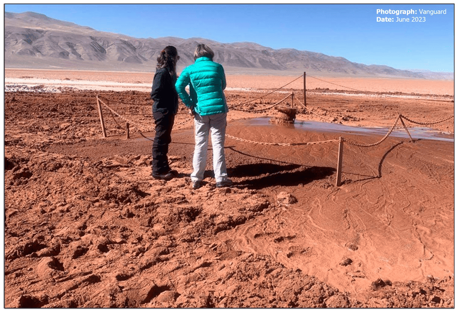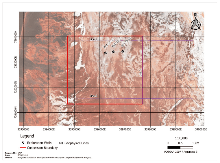 Exploration completed to date includes surface sampling, trenching, Transient Electromagnetic (“TEM”) and Magnetotellurics (“MT”) geophysical surveys, and the drilling of three diamond drill holes to depths of up to approximately 407 metres. Brine sampling from packer tests returned lithium concentrations of up to 169 mg/L. Brine flow was observed during drilling, with sustained flow over several hours in certain intervals. These results are historical in nature and support exploration targeting; a current Mineral Resource has not been established.