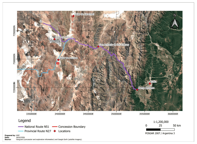 The Project benefits from access to nearby population centers and established regional transport infrastructure. The closest community is the village of Pocitos, which provides limited local services. The town of San Antonio de los Cobres, located approximately 120 km from the Project, serves as the primary local service hub, while the city of Salta, approximately 250 km away, functions as the main regional logistics, supply, and transportation center. A railway line passes through the Pocitos area as part of the regional rail network, although it is not currently utilized for project logistics.