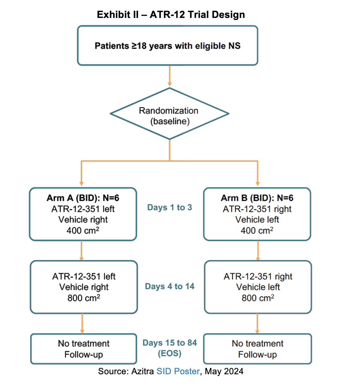 The study will apply ATR-12 to lesions on one side of a subject’s body and apply the vehicle to the other. Application of ATR-12 and the vehicle will be performed twice daily for two weeks. Patients will be randomized to receive ATR-12 on either the right or left side. Initially, the FDA required that patients be dosed one at a time and sequentially to provide an initial safety profile before allowing parallel enrollment. Azitra has since crossed this hurdle and had enrolled six patients as of mid-June 2025, achieving 50% of target enrollment. Two sites are active. One at Yale University and the other at Stanford in Northern California. The study requires that the young patients stay at the location for two weeks for treatment.