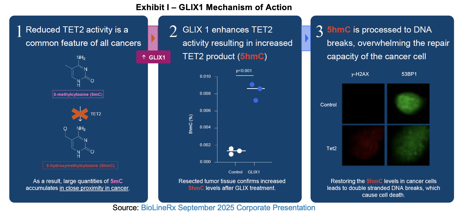 GLIX1 is a first in class, oral, small molecule that targets DNA damage response and repair vulnerabilities in cancers. GLIX1 restores ten-eleven translocation 2 (TET2) activity in cancer cells causing double-stranded DNA breaks and apoptosis in cancer cells. Initially, GLIX1 will be developed to treat glioblastoma (GBM), which is an attractive indication given GLIX1’s anti-tumor activity in multiple GBM models, its ability to penetrate the blood-brain barrier (BBB) and GBM’s status as a rare disease which confers several advantages to the drug development process.
