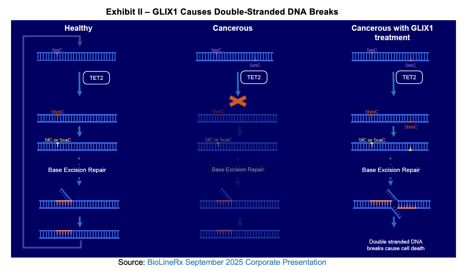 GLIX1 has a unique mechanism of action that targets DNA repair vulnerabilities in cancer cells while sparing healthy tissue. It targets Ten-Eleven Translocation 2 (TET2), an enzyme that has a central role in DNA demethylation, a key process in the regulation of gene expression, cell differentiation and development. TET2 is responsible for initiating the DNA demethylation cycle, which leads to single-stranded DNA breaks. In normal cells, this demethylation cycle occurs constantly and has no negative effect on the cell. Accordingly, preclinical work shows stimulation of this cycle by GLIX1 in normal cells also has no negative effect on the cell.