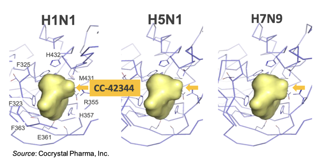CC-42344 is a broad-spectrum inhibitor of pandemic and seasonal strains of influenza A. It targets subunit PB2, which along with PA and PB1 forms the RNA-dependent RNA polymerase. This enzyme is essential for viral replication in cells by replicating the viral RNA segments and transcribing their genes, which makes it an attractive target for therapeutic intervention. The following figure shows CC-42344 binding to the highly conserved active site of the PB2 protein in different influenza strains.