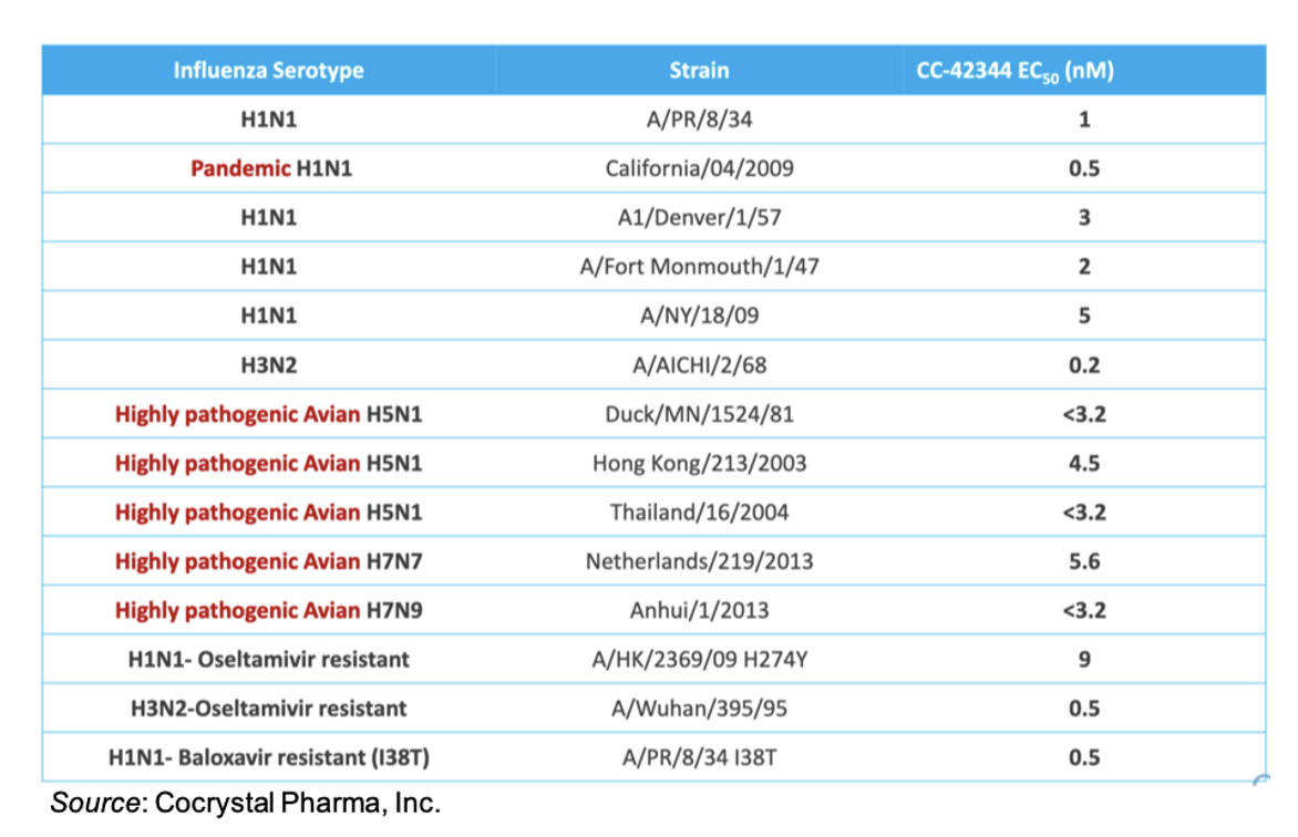Binding to this conserved active site leads to broad-spectrum antiviral activity against multiple Influenza A strains, including both pandemic and seasonal strains. The following table shows the strains that CC-42344 is active against, which includes strains that are resistant to oseltamivir and baloxavir.