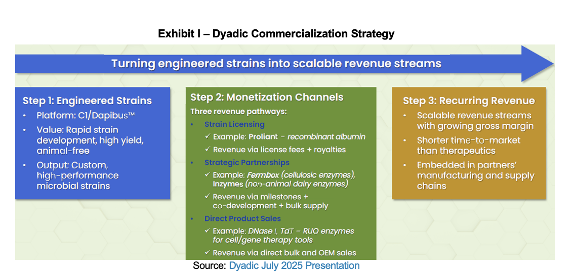 As of June 30th, 2025, cash, equivalents and short-term securities totaled $6.6 million compared to $9.3 million at the end of 2024. Cash burn during the first half of 2025 was ($2.1) million compared with ($3.1) million for 1H:24. There were minimal financing cash flows in the first half compared to a net $5.8 million in the same prior year period reflecting the net proceeds from the $6.0 million convertible note issuance. Following the end of the quarter in July, Dyadic issued 6,052,000 shares of its stock, offered at $0.95 per share. This generated gross proceeds of $5.75 million and net proceeds of $5.3 million. Funds will be used for product development, sales and marketing.