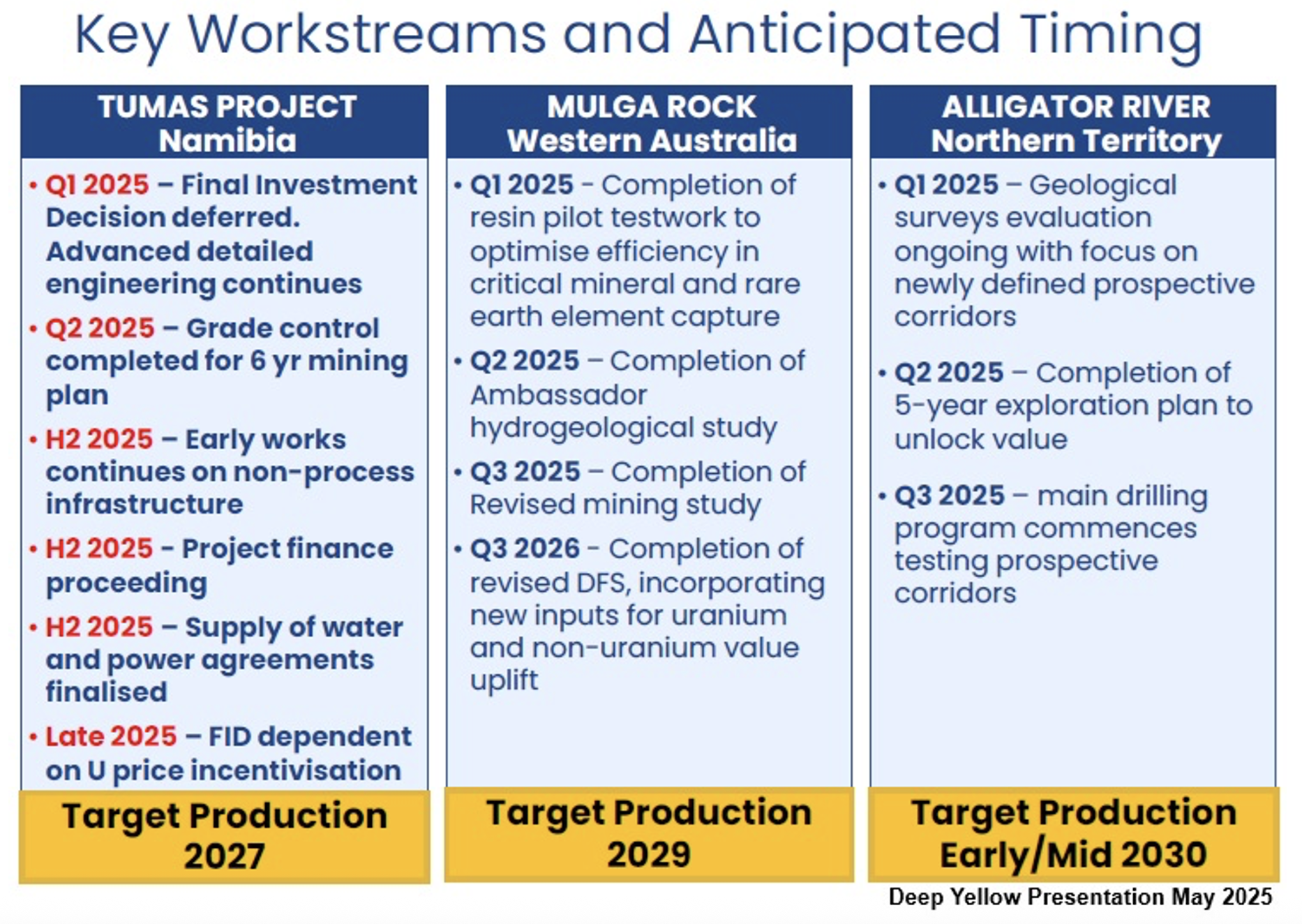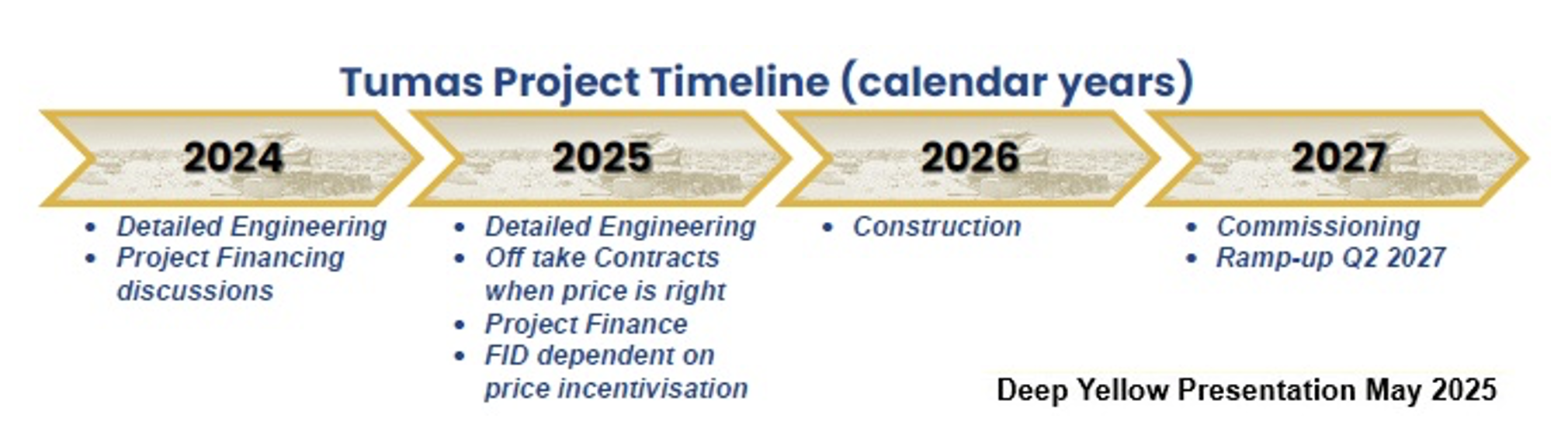 Deep Yellow has effectively used the last four months to de-risk the Tumas Project, materially advancing the Project to position the company to act decisively when uranium pricing prudently supports the go-ahead for this greenfield project. The work includes finalizing engineering plans, advancing process design, completing a construction access road, working on site preparation, awarding procurement packages, moving toward settling infrastructure contracts for water & power and completing other tasks for operational readiness. All these workstreams are on schedule as Deep Yellow progresses toward the ability to commence pre-production mining, process plant construction and operational ramp-up to full production.