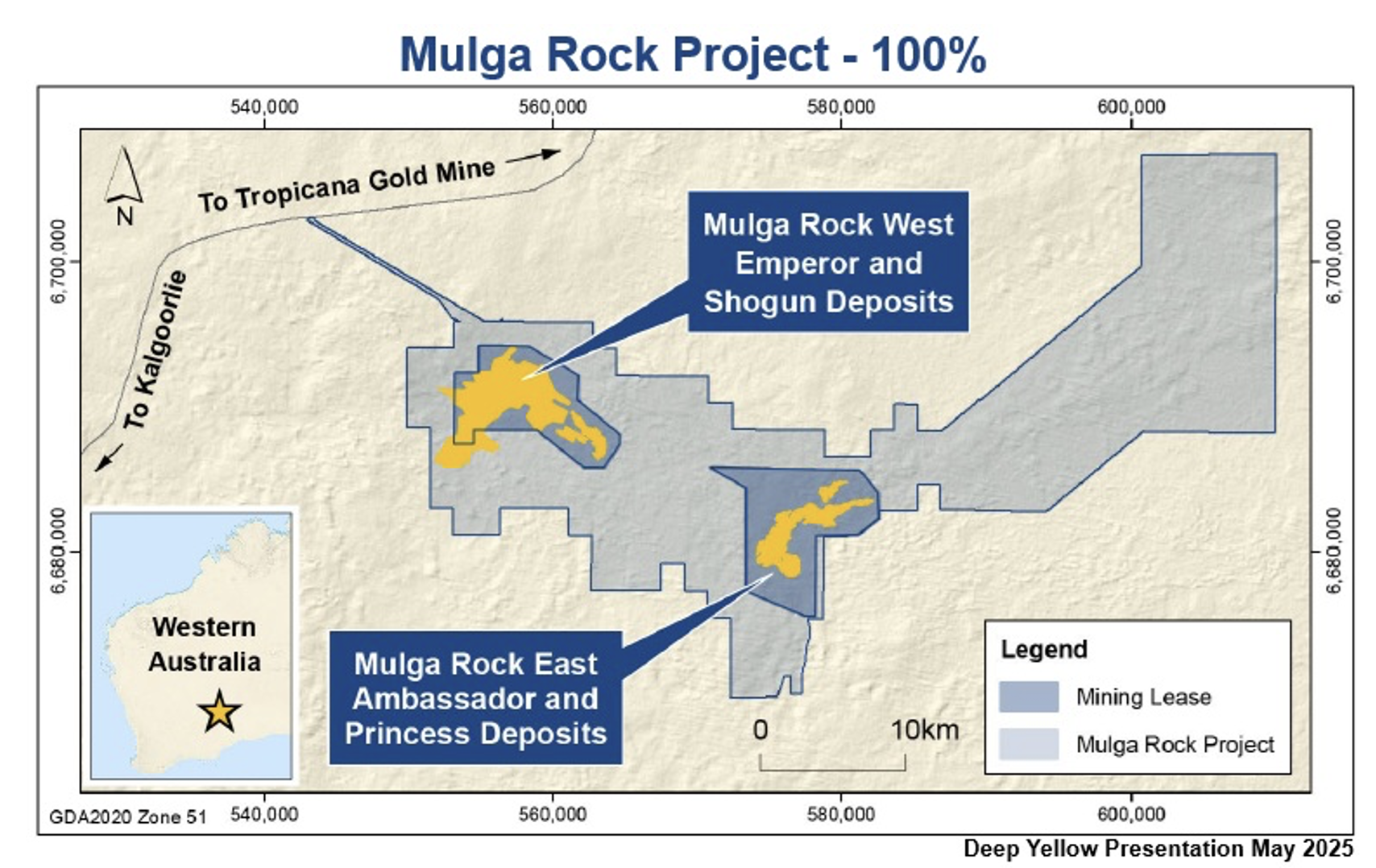 Acquired through the acquisition of VIMY, the Mulga Rock Project, which is located in Western Australia, has two mineralized areas, Mulga Rock East (consisting of the Ambassador and Princess deposits) and Mulga Rock West (Emperor and Shogun deposits). Deep Yellow’s primary focus in Australia is on the major resource areas in Mulga Rock East.