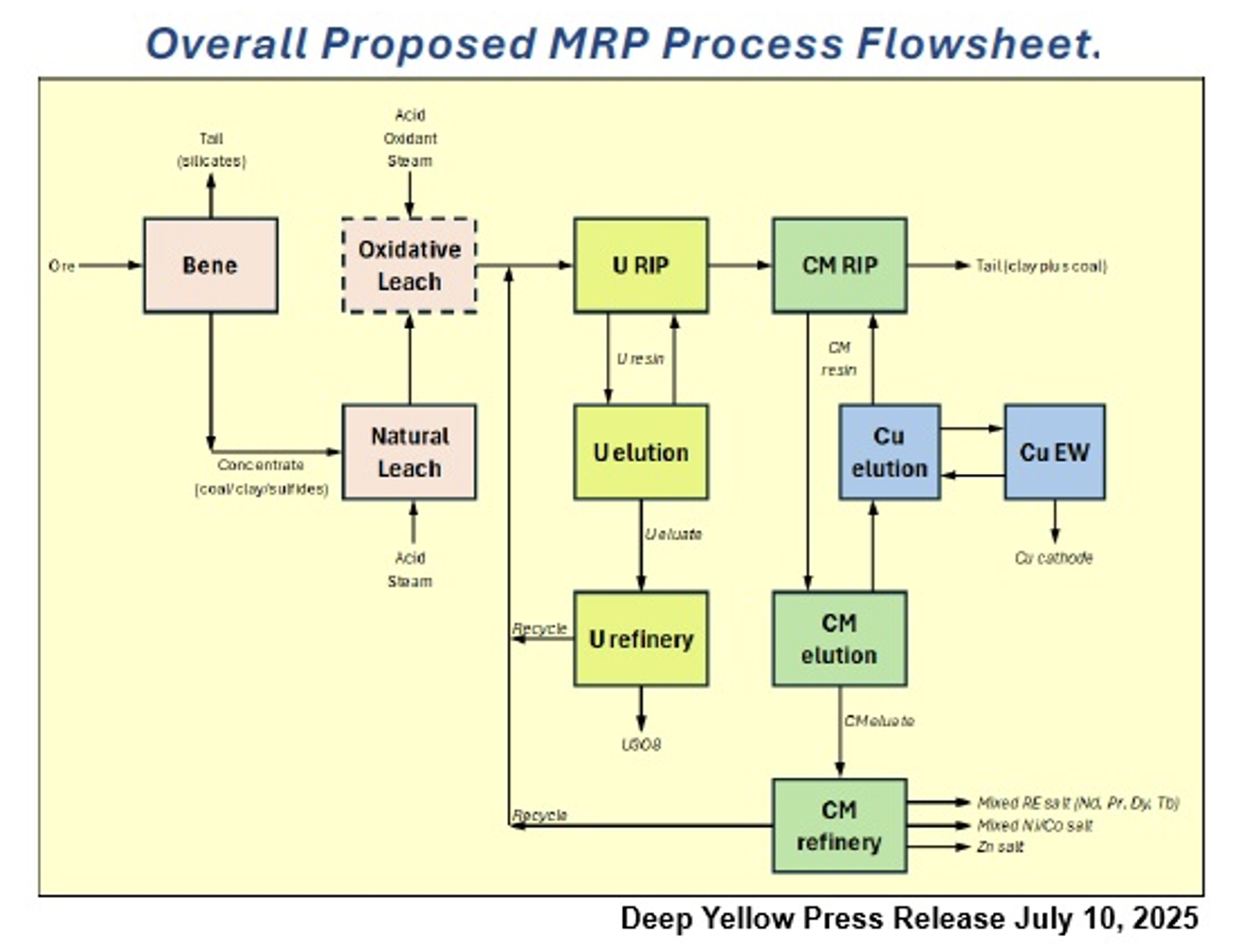 Other than the breakthroughs mentioned above, the process flow sheet involves beneficiation, natural & oxidative acid leaching of the beneficiation concentrate, a uranium Resin-in-Pulp (RIP) extraction circuit, a base metal &critical mineral RIP extraction circuit, uranium elution and refining, critical minerals elution refining and then in-pit tailings disposal (i.e., backfilling abandoned open pit surface mines with tailings).