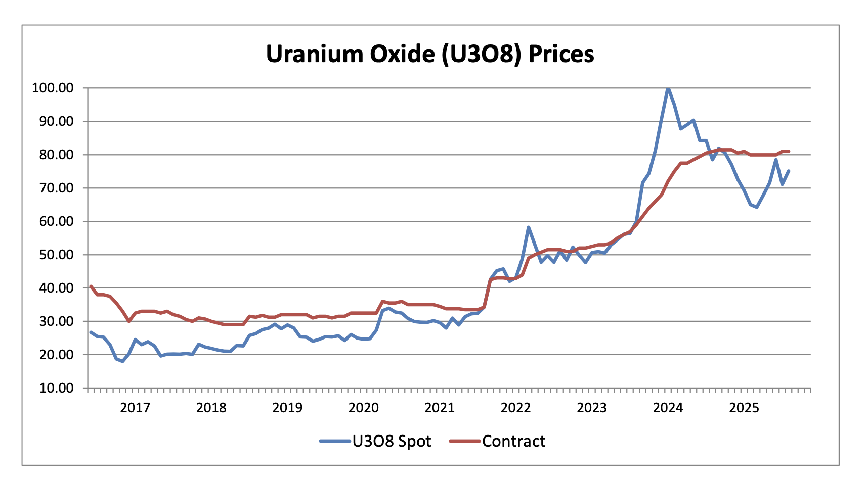 Meanwhile, the pricing in the uranium markets have improved. The spot price has rallied 18.3% from $63.50 per lb. U3O8 in mid-March to $75.13 per lb. in August. The long-term contract price has been stable around US$80.00 per/lb., hovering between $80.00 and $81.50 since July 2024.
