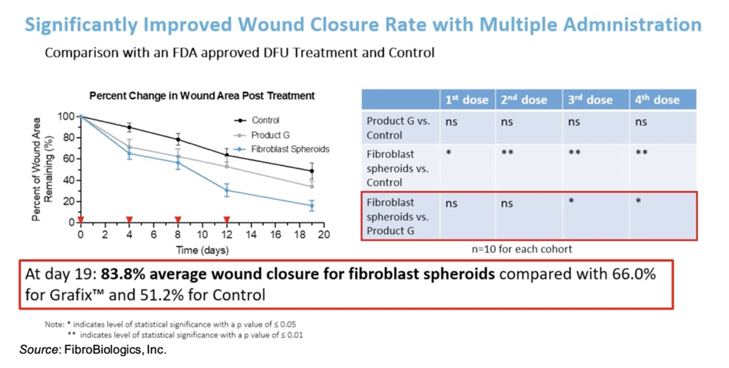 FibroBiologics has compiled a robust pre-clinical data set showing the efficacy of fibroblast spheroids in the treatment of wounds. For example, the following figure shows results using a diabetic mouse model in which administration of fibroblasts led to a statistically significant average 83.8% wound closure by Day 19 compared to 66.0% for Grafix™ and only 51.2% for control.