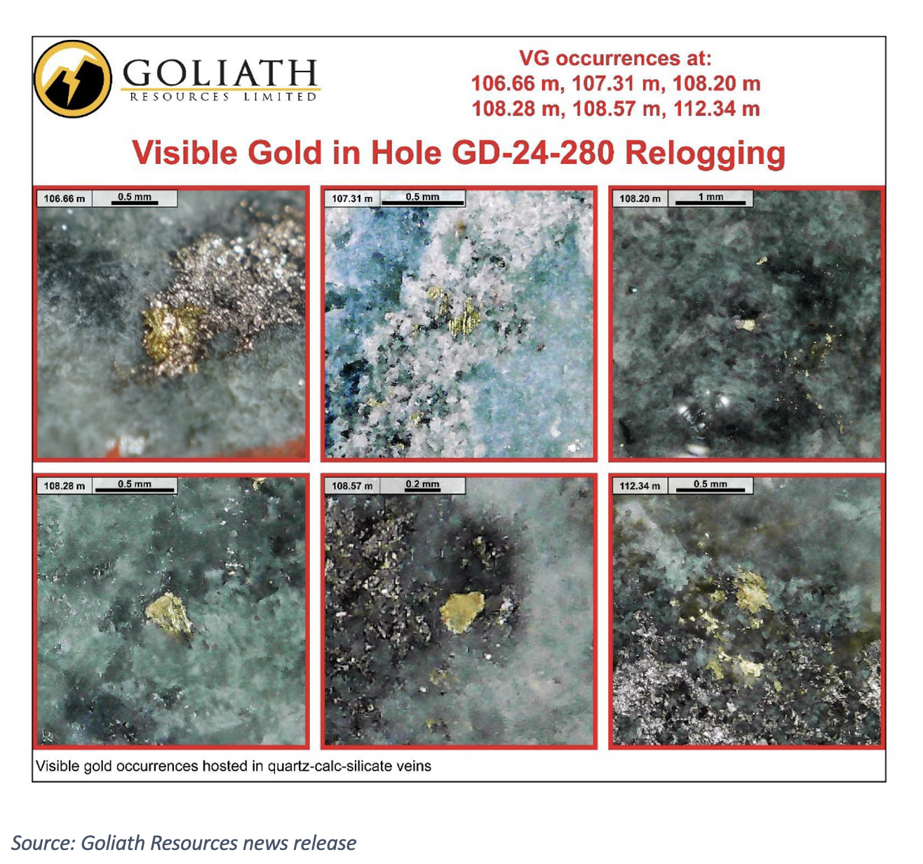 Goliath Resources’ Surebet Discovery continues to deliver high-impact results, confirming its status as a premier high-grade gold system in British Columbia’s Golden Triangle. The 2024–2025 drill programs yielded a 94% and 76% visible gold intersection rate, respectively, with 100% of holes intersecting quartz-sulphide mineralization. Key intercepts include 132.93 g/t GoldEq over 10.00 meters (Bonanza Zone), 12.03 g/t GoldEq over 10.00 meters (RIRG dykes), and 10.60 g/t Gold over 22.82 meters (calc-silicate breccia). The mineralized footprint spans 1.8 km², remains open, and includes 12 stacked veins and four Eocene-aged dykes. Metallurgy confirms 92.2% gold recovery, including 48.8% free gold via gravity. A new magmatic-source model across three rock packages enhances tonnage potential and supports future resource definition. These results materially de-risk the project and position Goliath for valuation uplift.