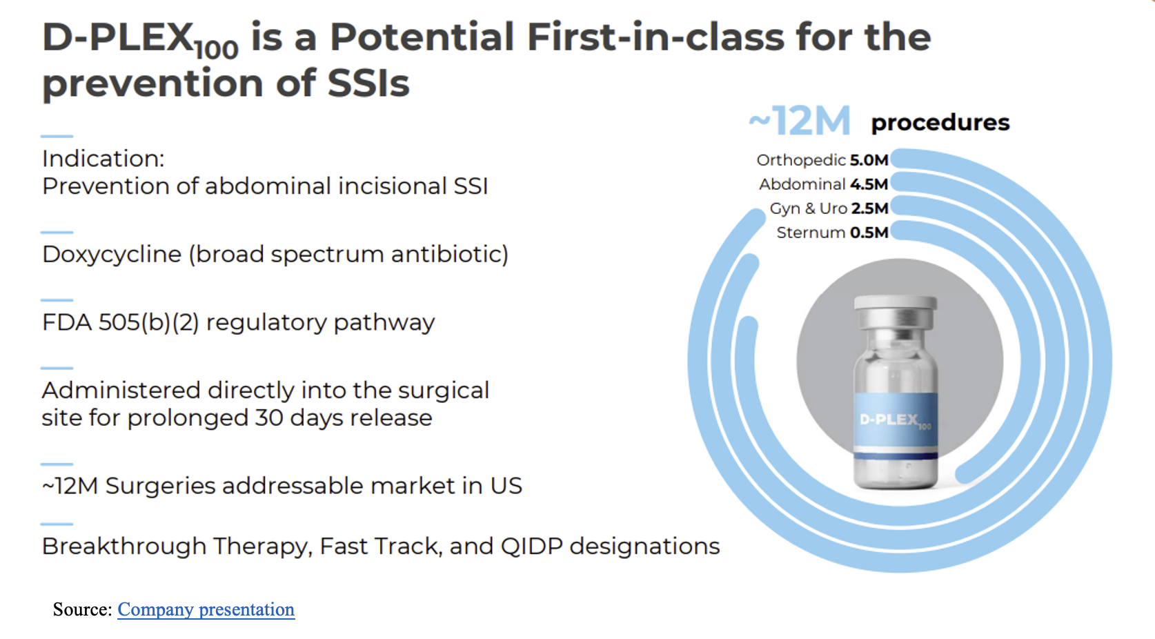 The PLEX platform is flexible and can deliver a variety of therapies, including small molecules, proteins, peptides, and nucleic acids. In addition to studying the efficacy of D-PLEX₁₀₀ in treating abdominal surgery patients, the company also expects to study it for the treatment of patients who require orthopedic surgery. PolyPid also has OncoPLEX in its product pipeline for treatment in oncology patients undergoing surgery and is also exploring licensing opportunities to expand its platform technology and product candidates globally. In addition, PolyPid has entered into an R&D collaboration with ImmunoGenesis to develop novel treatments for solid tumors, leveraging its PLEX technology.
