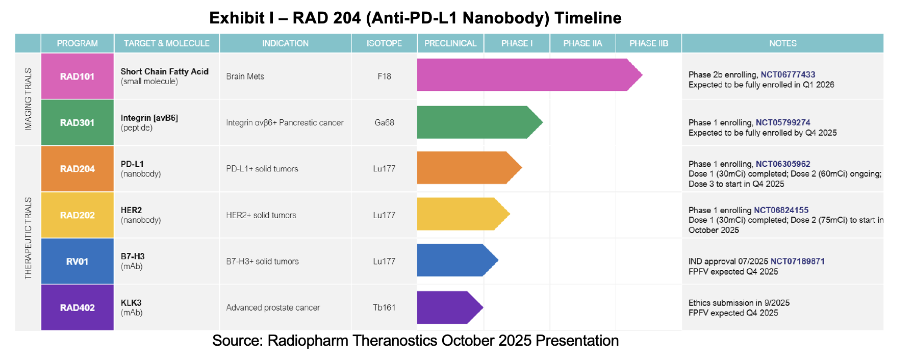 On October 20th, Radiopharm provided clinical updates for its RAD 101, RAD 202, RAD 204 and RAD 301 programs. All of the studies have generated interim or preliminary data supportive of further advancement of the respective assets either in the ongoing trial or the next phased trial. Management also voiced its intent to launch Phase I trials for RV01 and RAD 402 by year end. Below we provide refreshed milestones shared in the press release. See our report dated November 3rd, 2025 for program updates.