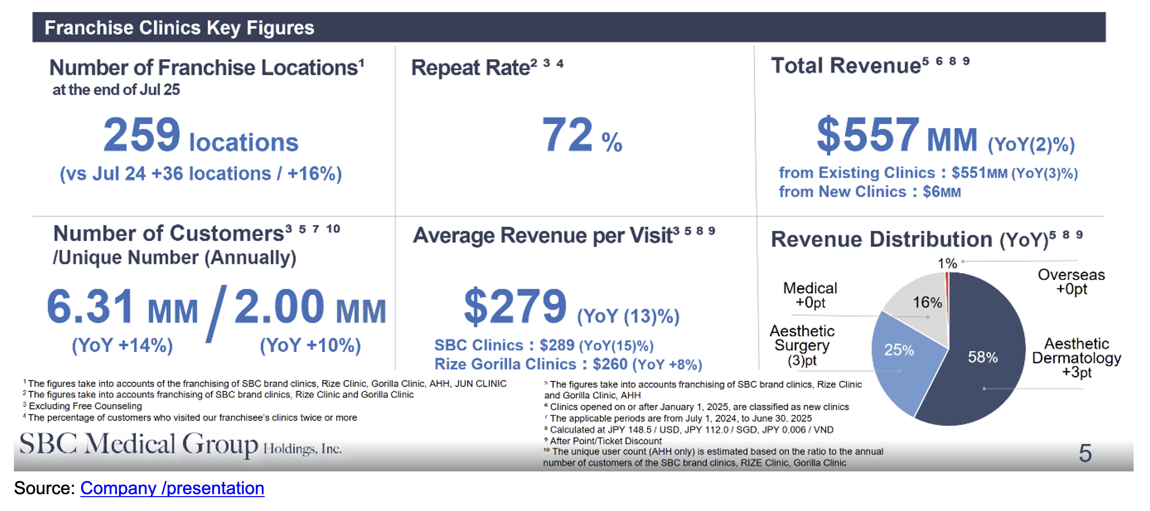 For example, last week SBC launched a new brand, “Hada no Aozora Clinic”, which is scheduled to open in Tokyo on October 1, 2025. Hada no Aozora clinics will use a hybrid dermatology model integrating insurance-covered general dermatology and private-pay aesthetic treatments. Non-surgical procedures increased from about 1.62 million in 2017 to 3.06 million in 2024, and the share of total aesthetic treatments they attained increased from 83% to 88% over the same period, according to the Japanese Society of Aesthetic Plastic Surgery. The company believes this reflects a growing preference for non-invasive techniques.