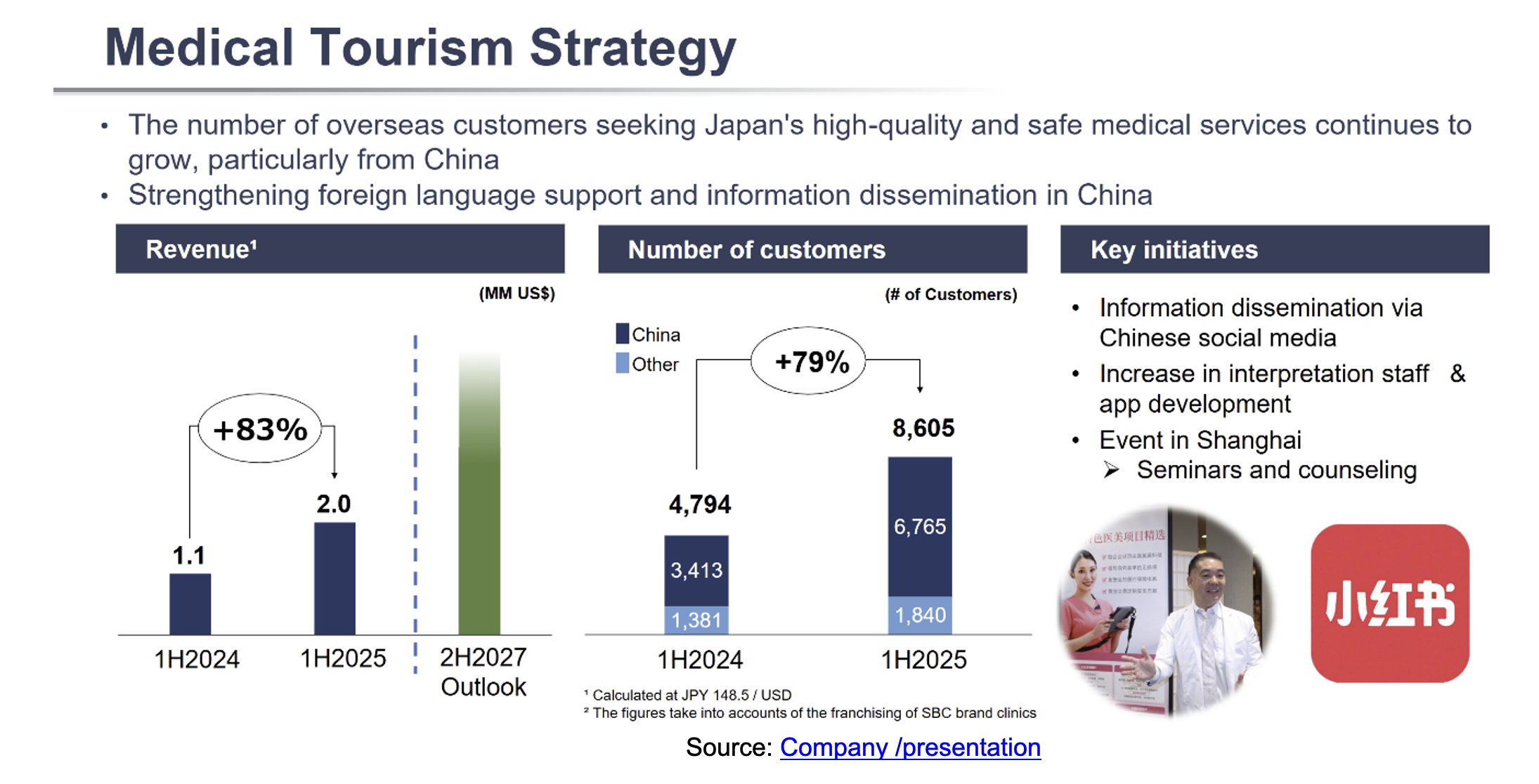 The company’s CEO notes that “given the declining domestic population, the Japanese medical sector has two viable paths for growth: we must either attract more international patients or bring Japanese medical expertise abroad.” SBC is pursuing both strategies and is optimistic about its medical tourism strategy. SBC is enhancing its multilingual support to be responsive to visitors from China and other countries seeking treatment, and also using social media as an outreach tool to accelerate customer acquisition efficiently. The company is also enhancing its presence on social media, particularly in China, which management noted has led to an increase in visits and revenue from foreign medical tourists. In addition, the company is strengthening its language support infrastructure by hiring more interpreters to provide positive experiences for international customers. The company expects efforts will not only diversify revenue sources, but also position SBC as a prime destination for medical tourists seeking aesthetic and other services.