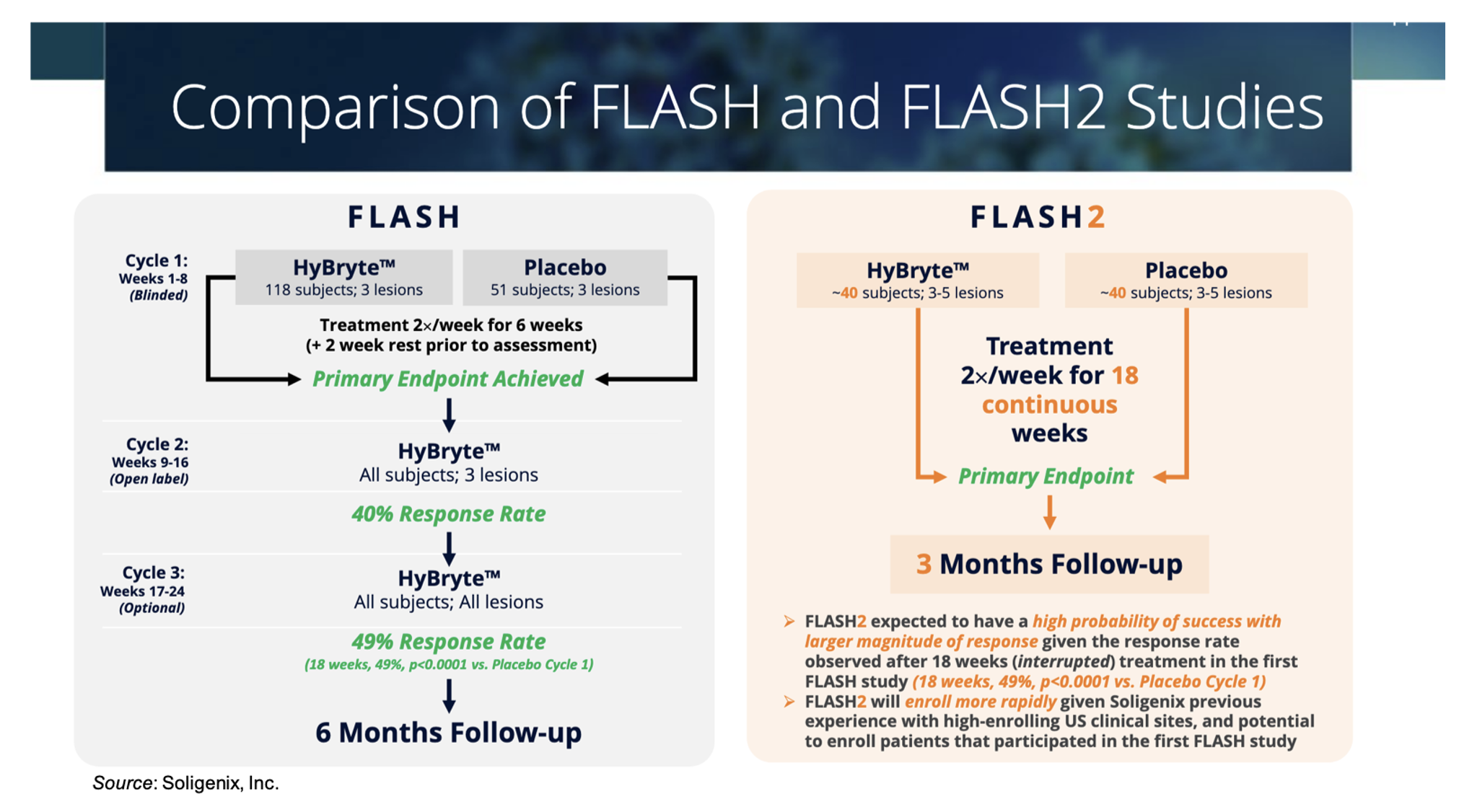 The Phase 3 FLASH2 Trial is evaluating HyBryte™ (SGX301 or synthetic hypericin) in 80 patients with early-stage cutaneous T cell lymphoma (CTCL). The FLASH2 trial is very similar in design to the successful Phase 3 FLASH trial, as shown in the following figure, which provides a comparison between the two studies. One key difference between the trials is that in the FLASH trial patients were treated for three cycles of six-weeks each, with a two-week break in between cycles and the primary efficacy endpoint was measured after the first treatment cycle, while in the FLASH2 trial patients will be treated for 18 consecutive weeks before the primary efficacy endpoint is assessed. Based on the results from the FLASH trial, we believe the FLASH2 trial has a high probability of success.