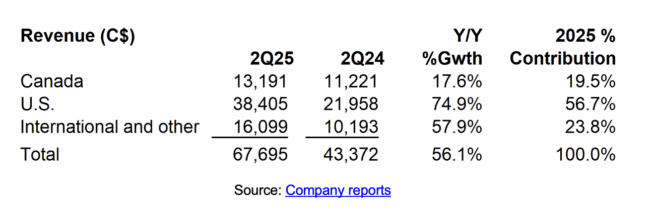 Swiss Water indicated that it is seeing growing demand from new and existing customers in Asia and the Middle East, among other markets. SWP expects that, despite potential near-term industry volatility, it remains well-positioned to continue to gain share within the decaffeinated coffee space, reflecting its natural decaffeination process and strategies. The company recorded higher revenue from all of its key markets in 2Q25, as illustrated below. Growth in international markets was a robust roughly 58%. Growth from U.S. sales increased nearly 75% compared to 2Q24.