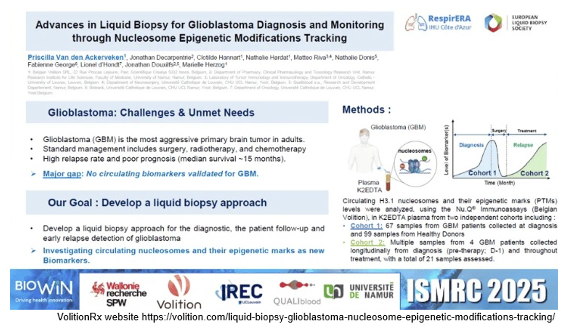 Nu.Q Cancer (poster – ISMRC conference): A poster titled “Advances in Liquid Biopsy for Glioblastoma Diagnosis and Monitoring through Nucleosome Epigenetic Modifications Tracking,” by Priscilla Van den Ackerveken et al was presented that concerns developing a liquid biopsy for the diagnosis and monitoring of patients with Glioblastoma (GBM), an aggressive cancerous brain tumor. The poster’s findings include that the Nu.Q H3.1 immunoassay allows for the tracking of epigenetic biomarkers, which mirror the clinical course of GBM patients.