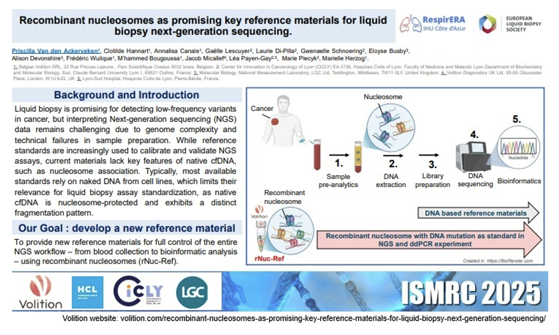 Nu.Q Cancer (poster – (poster – ISMRC conference): A poster titled “Recombinant nucleosomes as promising key reference materials for liquid biopsy next-generation sequencing,” by Priscilla Van den Ackerveken et al, was presented that concludes that recombinant nucleosomes (rNuc-Ref) could be promising key reference materials for liquid biopsy next-generation sequencing.