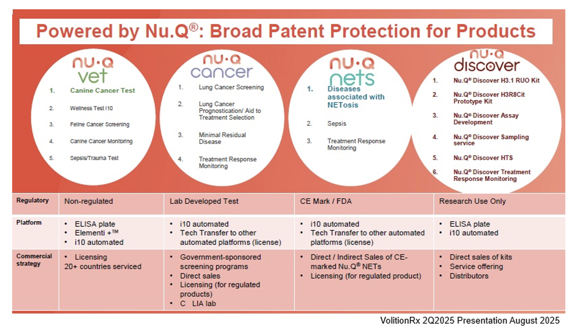 Nu.Q Discover (Operational Results in 2Q/2025): On August 14, 2025, VolitionRx reported financial results for the second quarter ending June 30, 2025. Nu.Q Discover had a strong quarter with demand for Nu.Q assays being used as exploratory biomarkers in clinical trials, driving revenue growth in both the product and service categories. The demand was bolstered by repeat customers.
