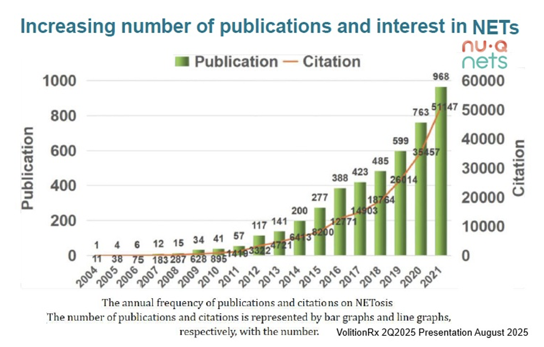 Nu.Q Discover (Application Note): On July 7, 2025, Volition posted a Nu.Q Discover Application Note titled “Nu.Q Discover: Nu.Q® H3.1: A Breakthrough Immunoassay for Reliable and Robust NETs Quantification.” The document is a general overview of the fundamentals of NETosis, the techniques to detect NETs, and how Volition’s Nu.Q H3.1 chemiluminescent immunoassay was engineered and developed to quantify circulating H3.1 nucleosomes in human plasma. The Nu.Q H3.1 assay has distinct attributes (high specificity & reproducibility) that make it a strong tool to track NETs formation in order to assess the severity of NETs-related pathologies(such as sepsis and COVID-19), which enables clinicians to identify, stratify, and monitor patient risk.