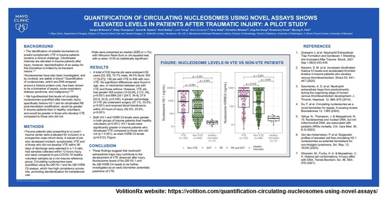 On July 8, 2025, Volition announced that it has achieved the ability to quantitatively determine nucleosome levels (a marker of NETosis) in whole venous blood utilizing a bedside lateral flow test. The blinded study of 25 hospital patients at the point-of-care demonstrated that strongly correlated with results from Nu.Q nucleosome assays processed at a central laboratory. This new ability allows for diagnostic assessment of nucleosome levels at doctors’ offices, emergency rooms and ICUs without the time delay inherent in sending a blood sample to laboratory for testing.